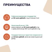 Подробнее с условиями программы можно познакомиться на сайте Мои финансы: https://xn--80apaohbc3aw9e.xn--p1ai/programma-dolgosrochnyh-sberezhenij-new/