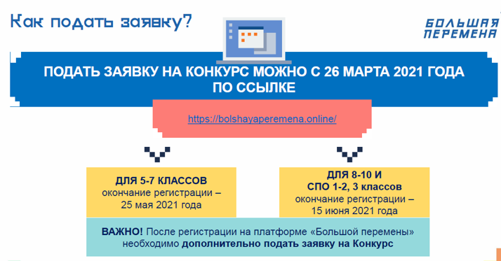 Регистрация для обучающихся 5-7-х классов общеобразовательных организаций открыта до 20 мая 2021 года, для школьников 8-10-х классов и студентов учреждений среднего профессионального образования — до 15 июня 2021 года.