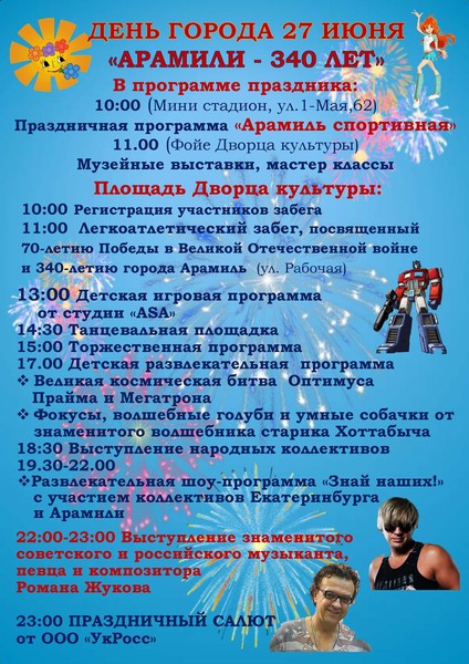 10:00 — 23:00 Комплексная культурно-массовая и спортивная программа (площадь ДК г. Арамиль, ул. Рабочая, 120-А):