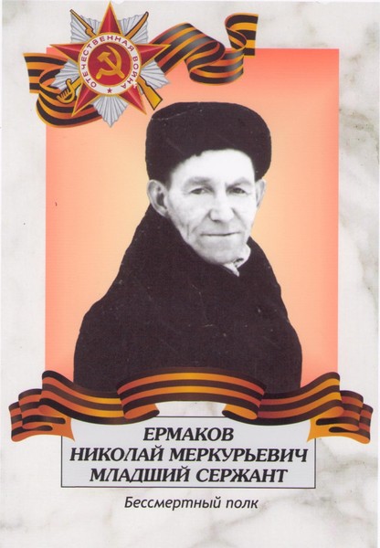 К сожалению моего отца Ермакова Николая Меркурьевича с 1907 года рождения участника Великой Отечественной Войны уже нет на свете. Призван был на фронт 27.07 1941 года. Ему было 34 года. Ермаков Николай Меркурьевич прошел всю войну, был контужен, имел награды. Вернулся с фронта в с. Патруши, где проживал до войны. Работал в колхозе им. Свердлова - водителем. У него была большая семья, и он прожил трудный, жизненный путь. Умер в возрасте 62 года.