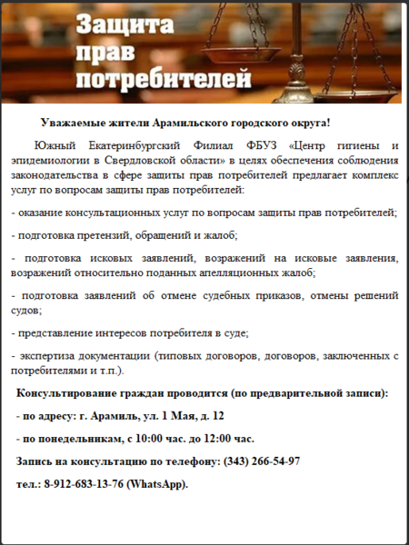 Специалисты по защите прав потребителей напоминают о том, что в случае возникновения спорных ситуаций с продавцом товаров (работ, услуг), за оказанием консультационной помощи, составлением претензии или искового заявления в судебные инстанции можно обращаться в консультационные пункты для потребителей (контактные данные можно найти по ссылке http://кц66.рф).