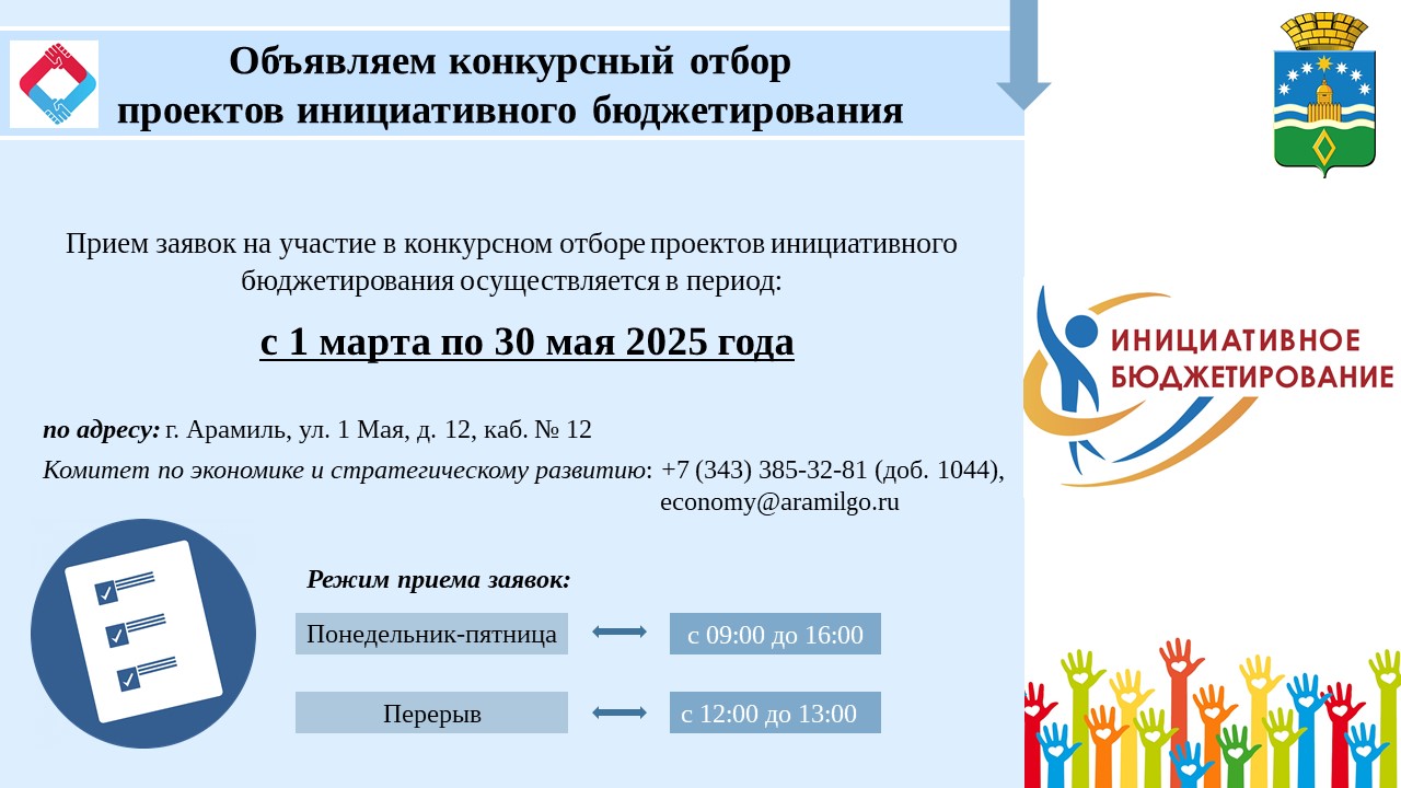 Администрация Арамильского городского округа объявляет о приеме заявок на участие в муниципальном этапе регионального конкурсного отбора проектов инициативного бюджетирования Арамильского городского округа.