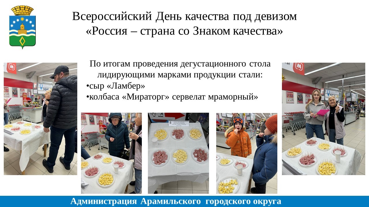 Комитет по экономике и стратегическому развитию Администрации Арамильского городского округа провел мероприятие, посвященное «Дням качества» – организовал дегустационный стол совместно с командой магазина «Магнит», расположенного по адресу: Свердловская область, г. Арамиль, ул. 1 Мая, 10. Цель проведения мероприятия – выявить лучший, по мнению жителей Арамили, товар среди предложенных.
