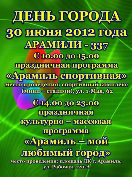 18:00 – 19:30 - торжественная программа «Арамиль – мой любимый город!»: конкурс семейного творчества «С мамой и папой делаем сами, дружной семьей и своими руками». Награждение почетных жителей, юбиляров и долгожителей, медалистов, подведение итогов конкурса «Чистый город - в наших руках!», награждение победителей соревнований по мини-футболу и волейболу;
