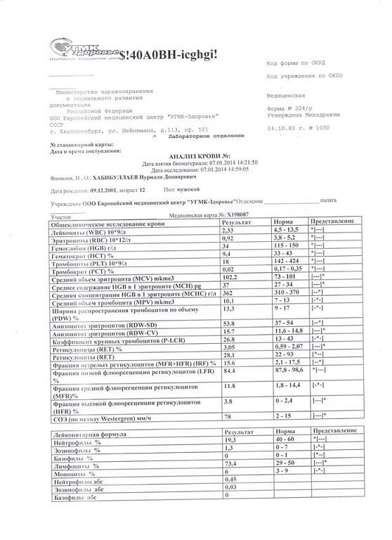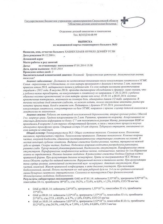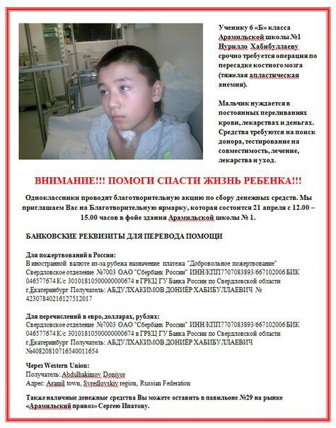 Ученику 6 «Б» класса Арамильской школы № 1 Хабибуллаеву Нурилло срочно требуется операция по пересадке костного мозга (тяжелая апластическая анемия).