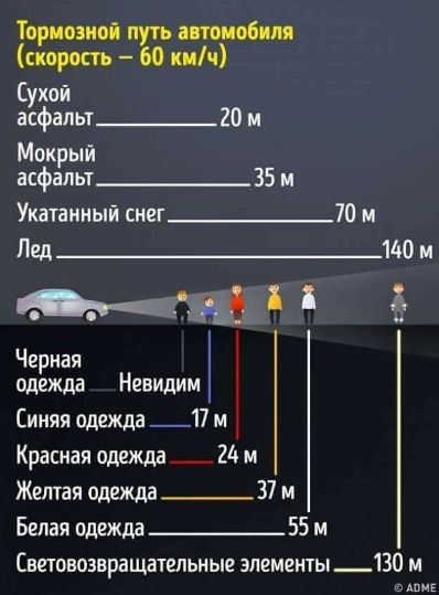 Пешеходы, в свою очередь, должны помнить о том, что тормозной путь автомобиля в таких условиях в разы увеличивается.