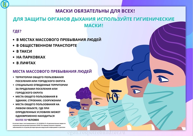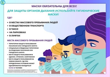 Учитывая данный фактор, на территории всех субъектов Российской Федерации действует обязательный масочный режим, предусматривающий ношение масок в общественных местах (в частности, при посещении торговых объектов, в общественном транспорте, парковках, лифтах и т.д.).