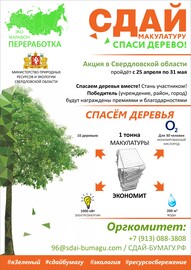 25 апреля по 31 мая года в Свердловской области будет проходить Всероссийский Эко-марафон ПЕРЕРАБОТКА «Сдай макулатуру – спаси дерево».