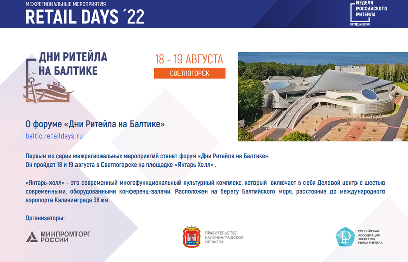 с 18 по 19 августа 2022 года в г. Светлогорске Калининградской области состоится межрегиональный форум «Дни ритейла на Балтике» (далее – Форум), организованный Минпромторгом России и Российской ассоциацией экспертов рынка