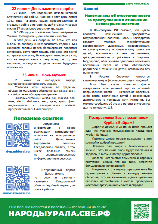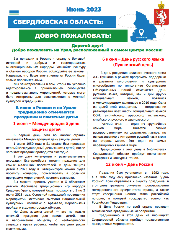 Департаментом внутренней политики Свердловской области разработан информационный бюллетень для иностранных граждан на июнь 2023 года, в котором содержатся сведения о государственных праздниках, памятных датах и полезная информация.