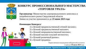 Администрация Арамильского городского округа информирует. Министерством агропромышленного комплекса и потребительского рынка Свердловской области проводится конкурс профессионального мастерства «Торговля Урала» в 2023 году, целью которого является стимулирование заинтересованности органов местного самоуправления муниципальных образований, расположенных на территории Свердловской области и хозяйствующих субъектов, осуществляющих торговую деятельность на территории Свердловской области, в организации и развитии отрасли потребительского рынка.