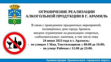 Согласно постановлению Главы Арамильского городского округа от 08.06.2023 № 251 «Об ограничении реализации спиртных, слабоалкогольных напитков, в том числе пива, во время праздничных мероприятий, посвященных Дню города Арамиль в Арамильском городском округе», предприятиям торговли и общественного питания всех форм собственности, необходимо ограничить реализацию спиртных, слабоалкогольных напитков, в том числе пива на период проведения праздничных мероприятий 24 июня 2023 года: