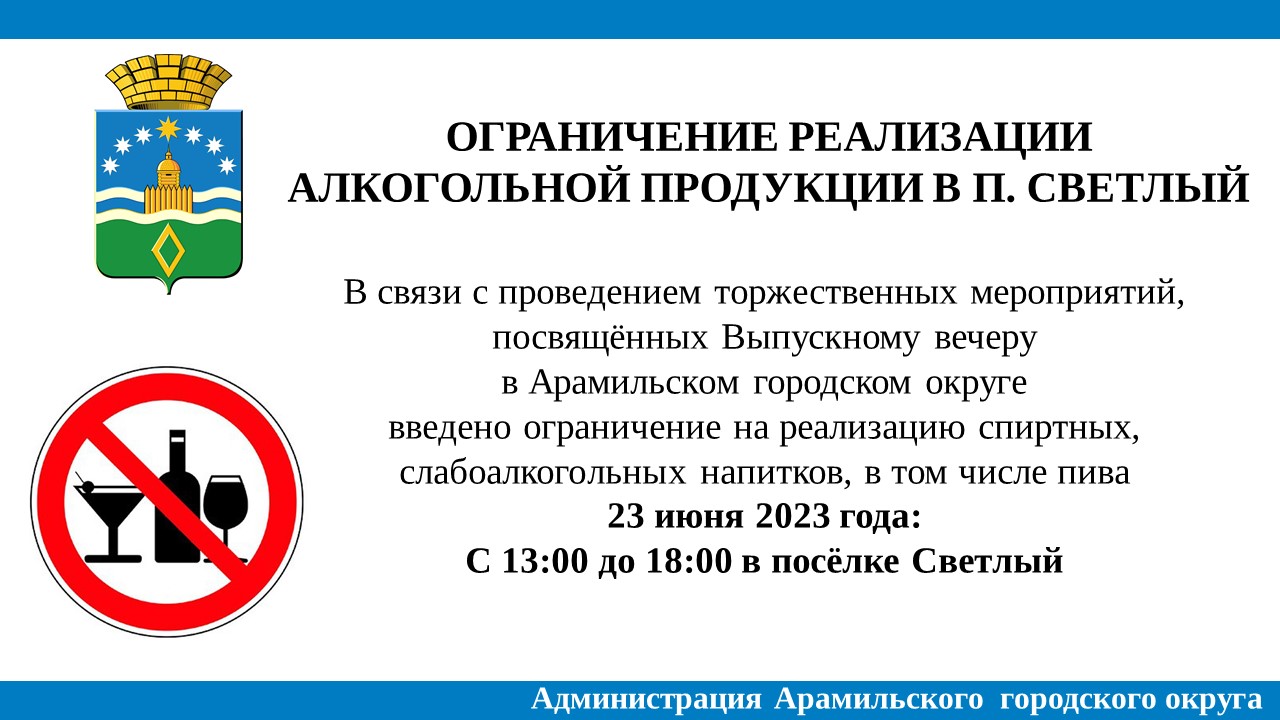 в Арамильском городском округе» 23 июня 2023 года с 13:00 до 18:00 предприятиям торговли и общественного питания всех форм собственности, расположенным на территории п. Светлый необходимо ограничить реализацию спиртных, слабоалкогольных напитков, в том числе пива.