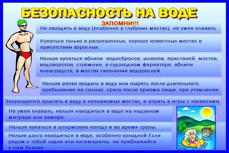 не подавать ложных сигналов тревоги, не плавать на надувных матрацах, камерах, досках;