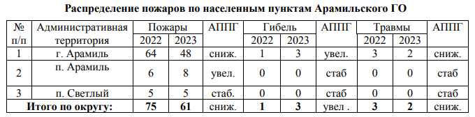 За 12 месяцев 2023 года на территории Арамильского городского округа произошел 61 пожар. При пожарах погибло 3 человека (2022 год – 1 человек), получили травмы различной степени тяжести 2 человека (2022 год – 3 случая).
