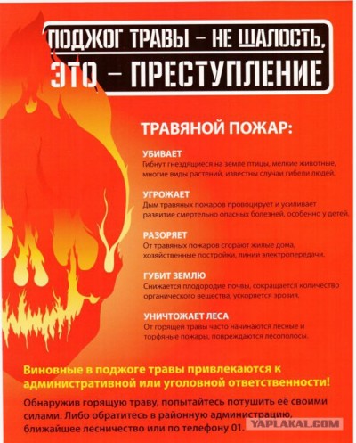 Несмотря на постоянные напоминания о недопустимости бесконтрольного сжигания сухой прошлогодней травы, каждый год повторяется одна и та же картина. Во многих местах весной можно наблюдать языки пламени, гуляющие по лугам. Некоторые люди, «влекомые», вероятно, благими намерениями, поджигают сухую траву. Подростки же видят в этом отличное развлечение, не задумываясь о последствиях.