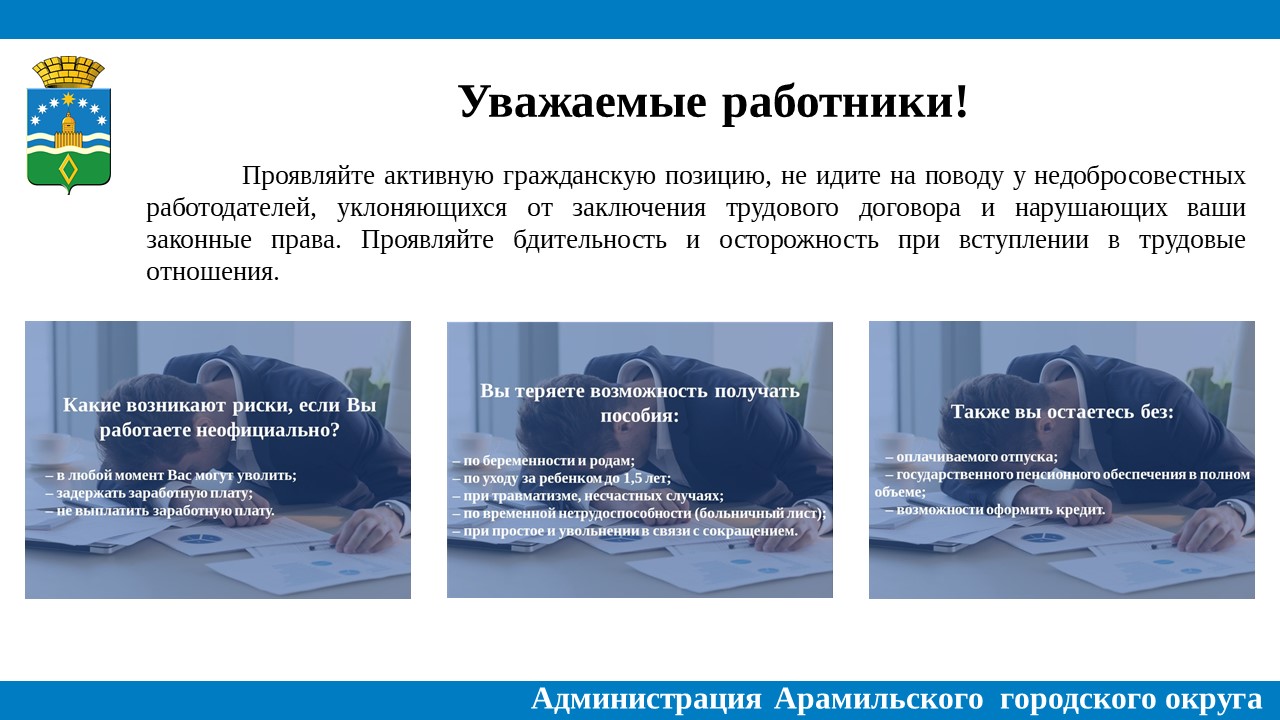 Призываем Вас строго соблюдать трудовое законодательство, проявить социальную ответственность и привести в соответствие трудовые отношения с каждым работником, не подвергая себя риску привлечения к установленной законом ответственности, применения санкций со стороны органов надзора и контроля.