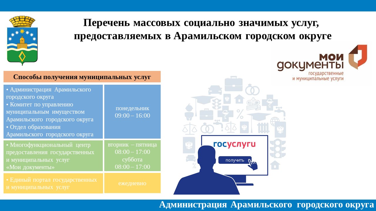 Перечень социально значимых муниципальных услуг размещен на официальном сайте Арамильского городского округа и доступен по ссылке https://www.aramilgo.ru/news/8908-administraciya-aramilskogo-gorodskogo-okruga-informiruet.html