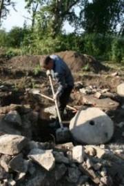 Мы идем к месту, где была сделана самая основательная находка – большой каменный круг с отверстием посередине. С виду он похож на жернов, использовавшийся в старину для перемалывания пшеницы в муку. На самом деле это закладной камень под престол, который находился в середине алтаря. Именно где-то здесь, в алтарной части, вероятно, был похоронен Петр Арамильский – такие сведения есть в его жизнеописании.