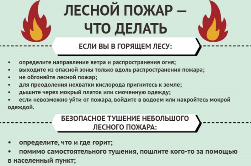 - бегите вдоль фронта огня; не обгоняйте лесной пожар; для преодоления нехватки кислорода пригнитесь к земле;