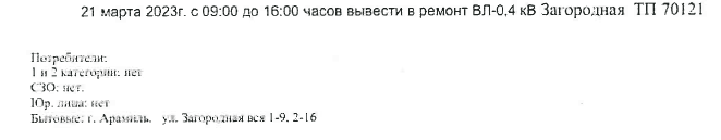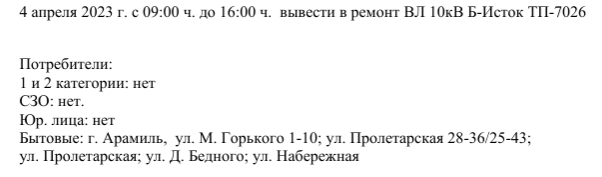 4 апреля 2023 г. с 09:00 ч. до 17:00 ч. вывести в ремонт ВЛ 10кВ Б-Исток ТП-7026