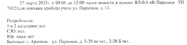 16 марта 2023 г. с 09:00 до 13:00 часов выводится в ремонт ВЛ 0,4 кВ Свердлова-Декабристов от ТП 7488 для выполнения нового технологического присоединения.