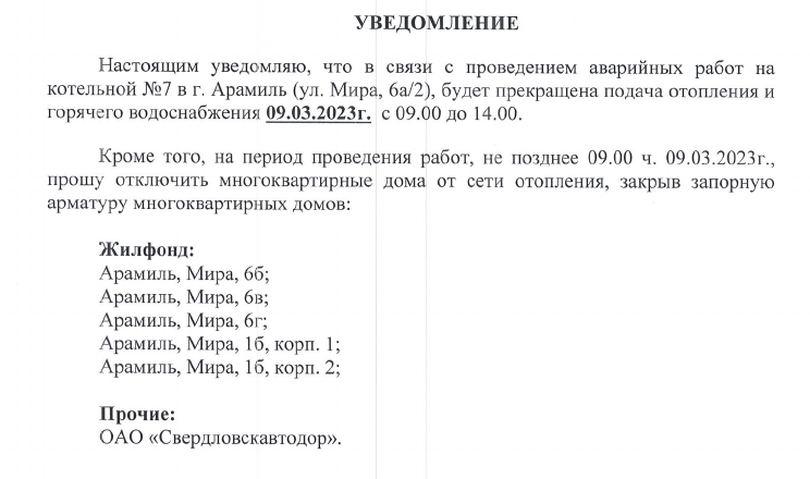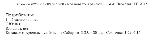 Внимание!!! 13.03.2023г. с 13-00 до 17-00 час. в п. Арамиль (Мельзавод-4) будет произведено полное ограничение подачи ХВС, в связи с отключением эл.энергии МРСК и остановом скважины.