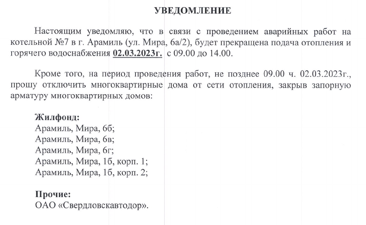 10 марта 2023 г. с 09:00 до 16:00 часов вывести в ремонт ВЛ-0,4 кВ «Октябрьская» от ТП7003. Потребители: 1 и 2 категории: нет СЗО: нет. Юр. лица: нет Бытовые: г. Арамиль. ул. Октябрьская, д, 59-103 не чет., 42-100 чет.